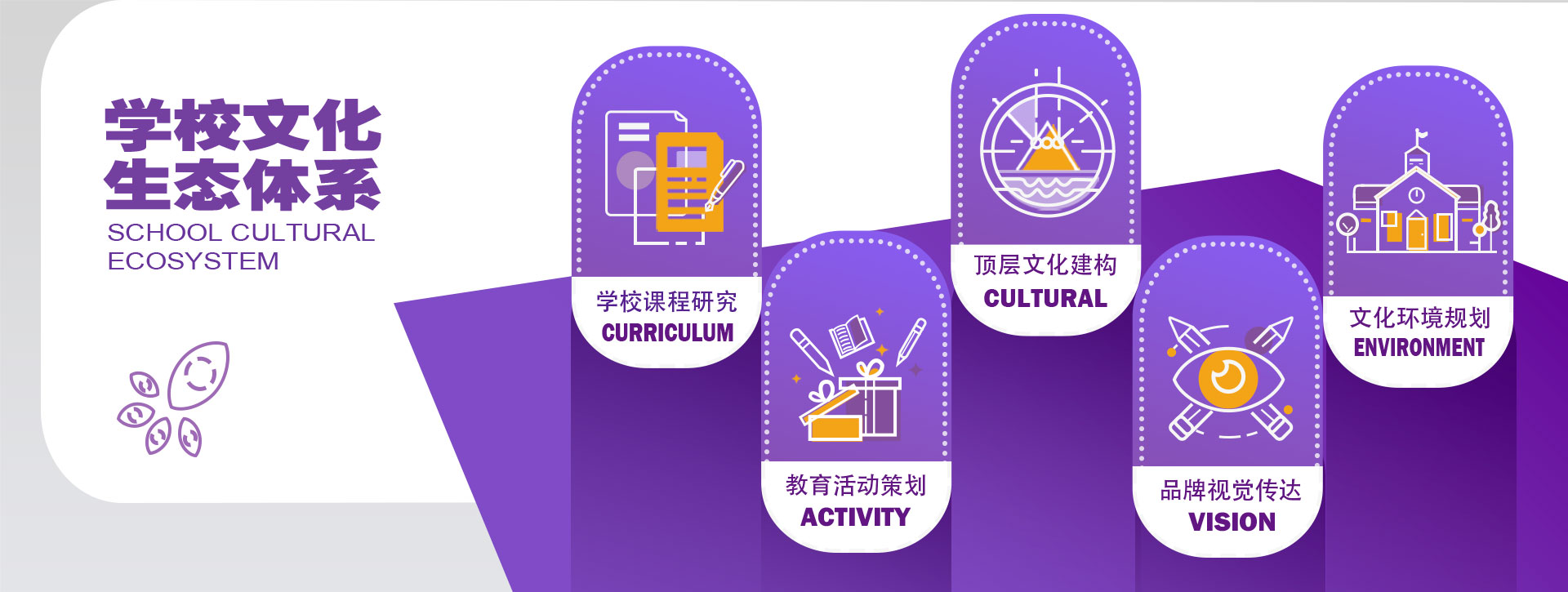 顶层文化建构 品牌视觉传达 文化环境规划 学校课程研究 教育活动策划